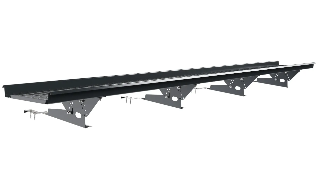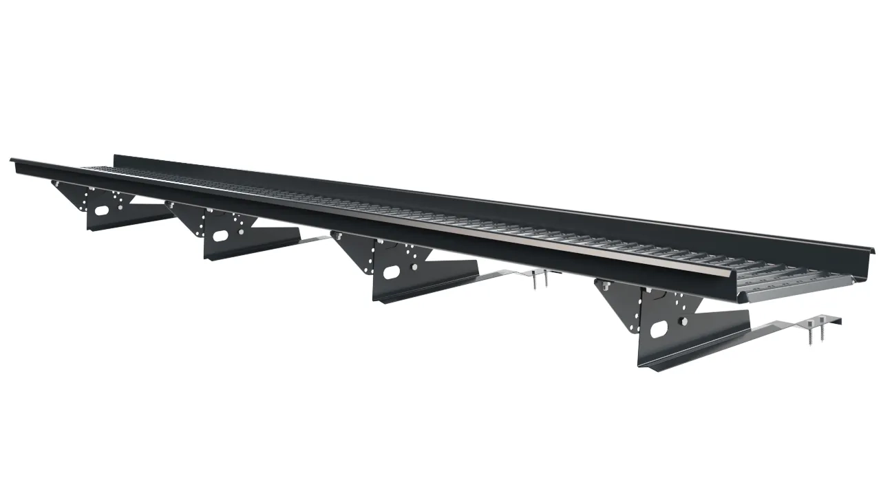 Переходной мостик Borge 3 м для натуральной черепицы — удлинённая секция с крюковыми кронштейнами, которые заводятся между рядами керамической или бетонной черепицы. Кронштейны не повреждают черепицу, распределяют нагрузку на несколько плиток.