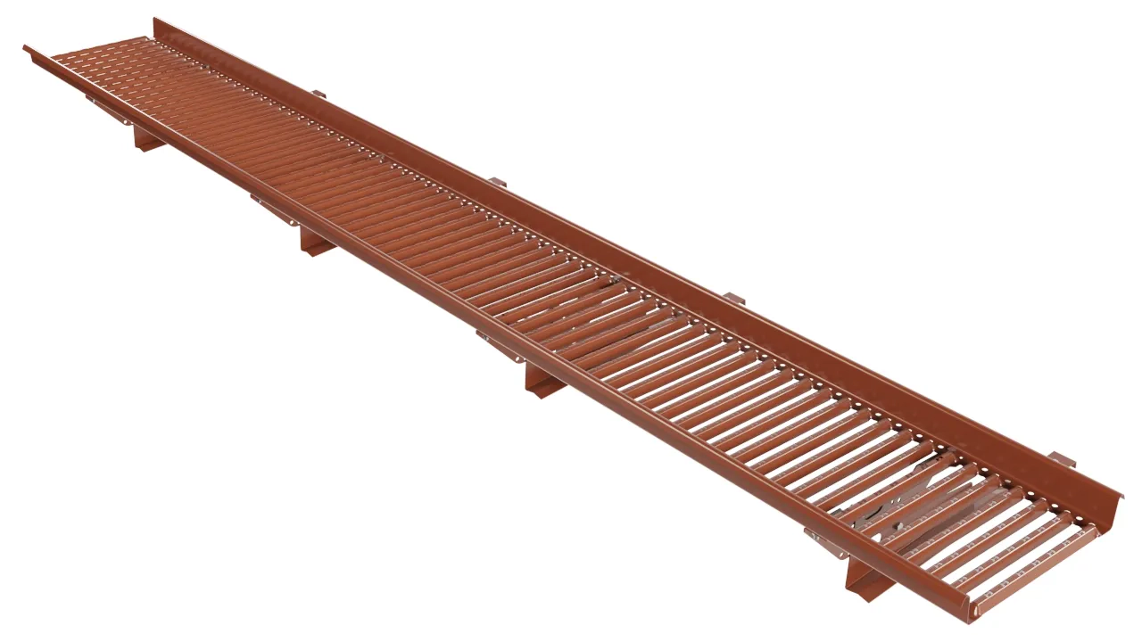 Переходной мостик Borge 3 м для натуральной черепицы — удлинённая секция с крюковыми кронштейнами, которые заводятся между рядами керамической или бетонной черепицы. Кронштейны не повреждают черепицу, распределяют нагрузку на несколько плиток.