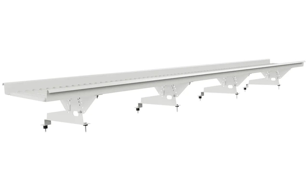 Переходной мостик Borge 3 м для металлочерепицы 350 мм — удлинённая секция с кронштейнами, рассчитанными на шаг обрешётки 350 мм. Для высокопрофильной металлочерепицы типа Монтерроса, Трамонтана, где шаг волны увеличен — стандартные кронштейны не попадут в точки крепления.