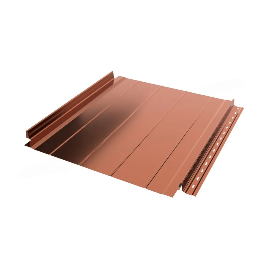 Фальцевая панель Металл Профиль FASTCLICK-Н Purman представляет собой металлический материал с оформленными особым образом краями. Они служат в качестве замков, с помощью которых панели соединяют друг с другом. Стальная основа материала защищена цинковым слоем и полимерным покрытием. В связи с этим кровля из фальцевых панелей устойчива к непогоде и надолго сохраняет первоначальный внешний вид.