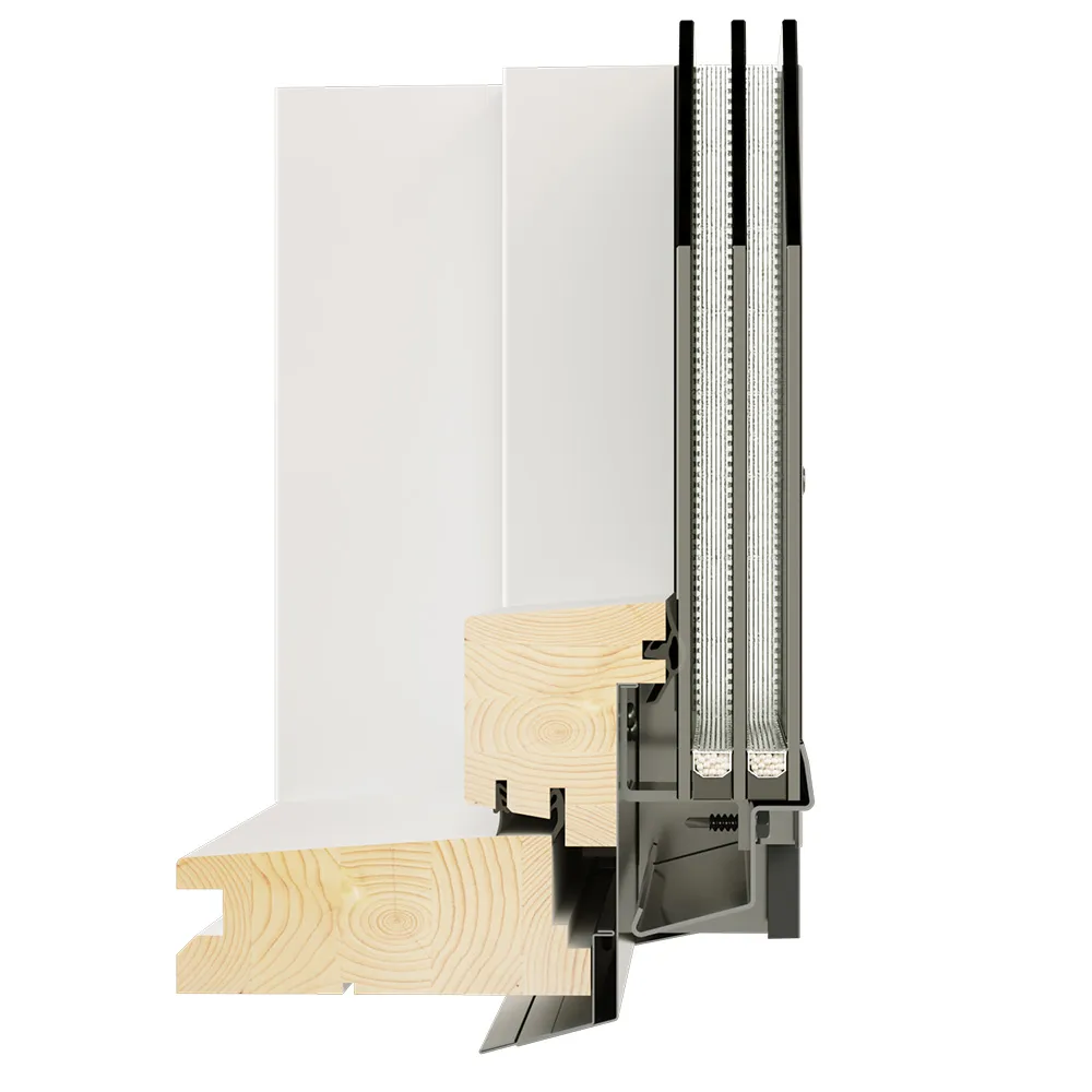 Толщина оконной коробки 150 мм (у западных и китайских производителей не более 120 мм). Не промерзает, не протекает, нет «ледяного замка». Рама покрыта белой акриловой краской. |